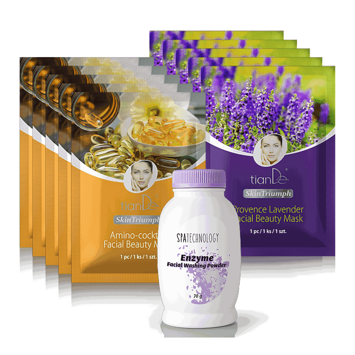 Sada Expresní proměna obsahuje: enzymatický pudr na mytí pleťová beauty-maska Aminokoktejl, 5 ks pleťová beauty-maska Levandulová Provence, 5 ks