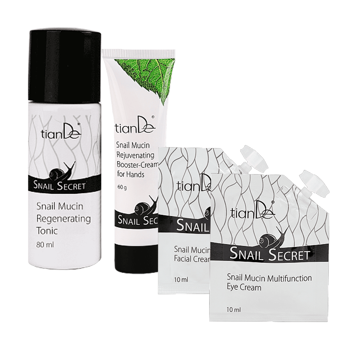 Sada Mládí ve Vašich rukou obsahuje: vícefunkční krém na obličej s mucinem hlemýžďů, vícefunkční krém na oči s mucinem hlemýžďů, regenerační tonikum s mucinem hlemýžďů, omlazující krém-booster na ruce s mucinem hlemýžďů.