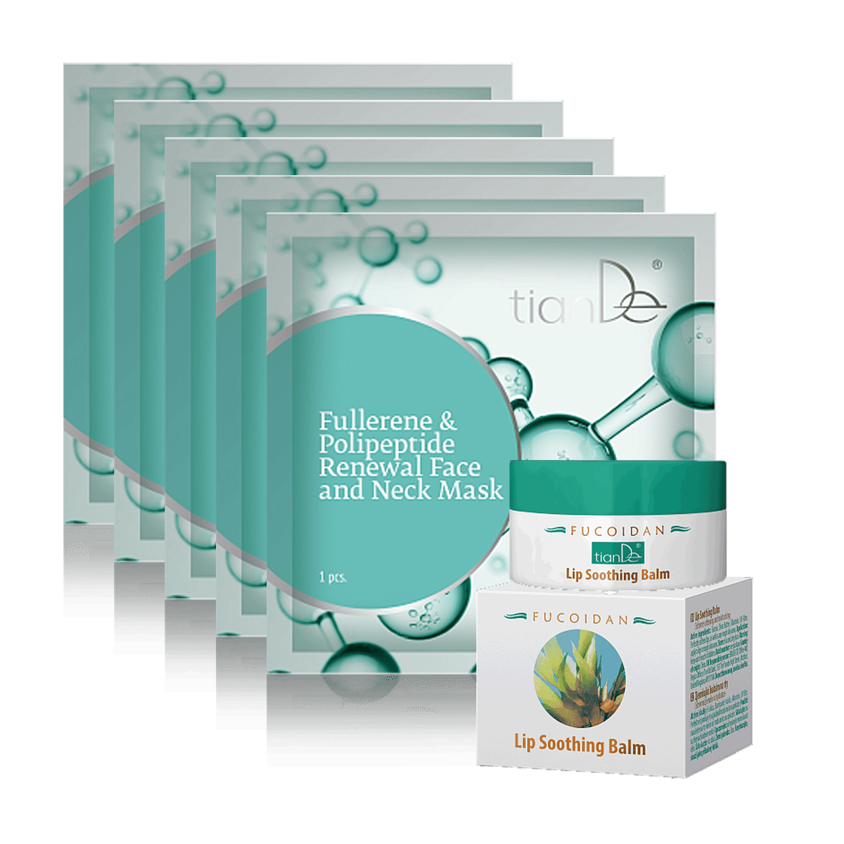 Sada Obrys mládí obsahuje: zjemňující balzám na rty obnovující maska na obličej a krk s fullereny a polypeptidy, 5 ks