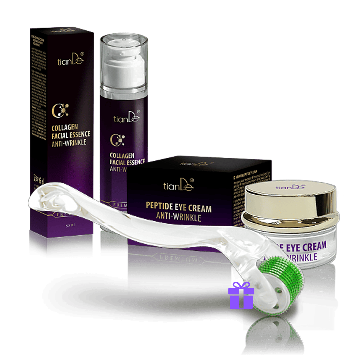 Kupte dva přípravky: kolagenovou pleťovou esenci na vrásky + peptidový krém na oční víčka na vrásky, a za 1 Kč získáte masážní váleček mezoroller.