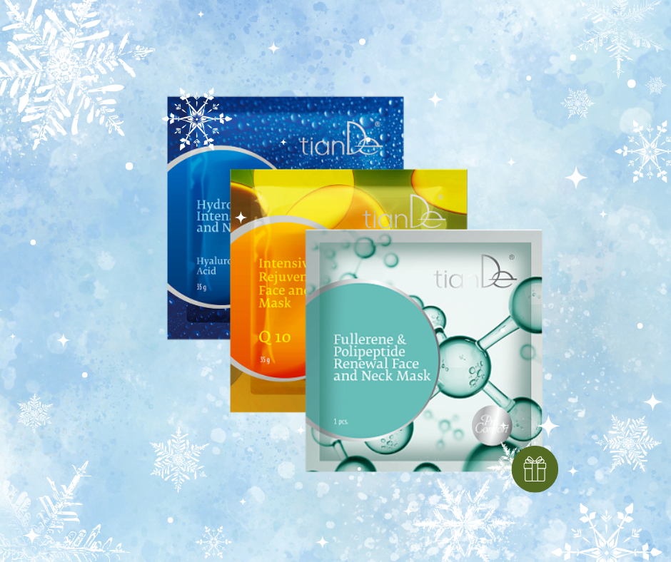 Kupte 2 masky na obličej a krk: intenzivní hydratační Hyaluronová kyselina + intenzivní omlazující Q10, a za 1 Kč získáte obnovující masku na obličej a krk s fullereny a polypeptidy.