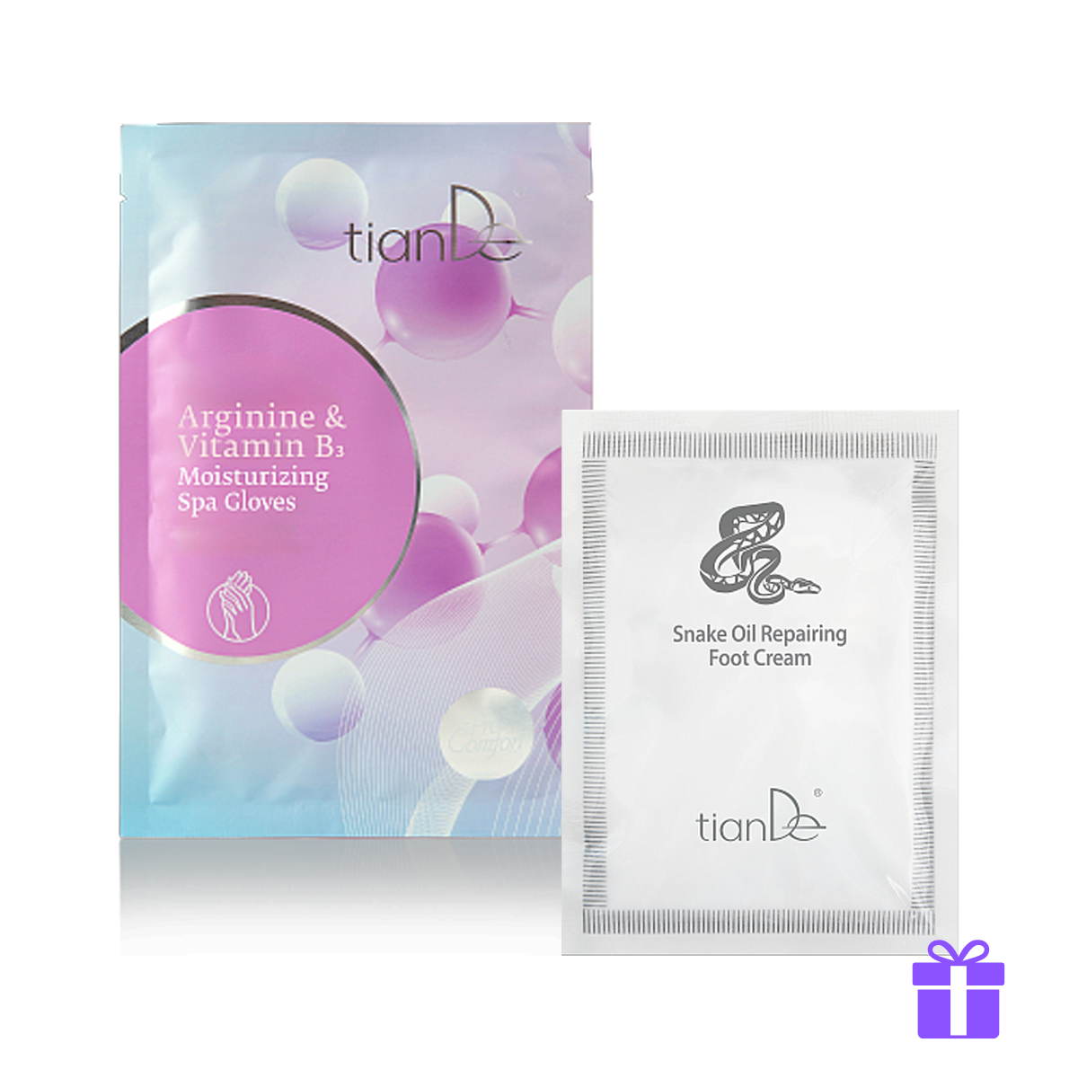 Zkroťte něžnost s výhodnou nabídkou, která zajistí dvojitou péči. Spa rukavice s argininem a vitamínem B3 navrátí pokožce rukou hebkost a hladkost již po prvním použití a poskytnou jí rychlou regeneraci. Dárkem k jejich nákupu je krém na nohy na bázi cenného hadího oleje, který dokáže obnovit a vyživit i velmi suchá místa.