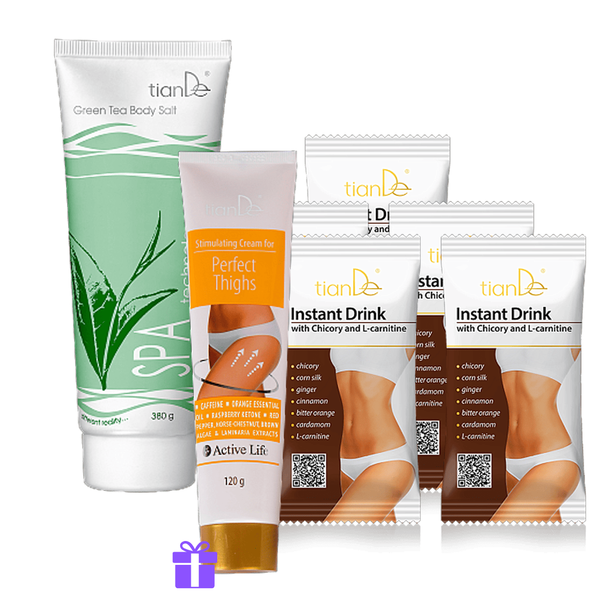 Elegantní křivky vyžadují komplexní přístup. Tělová sůl s podmanivou vůní pomáhá zlepšit tonus a kvalitu pokožky, krém-stimulátor pro dokonalý vzhled stehen se zahřívacím efektem cíleně pečuje o problematické partie a instantní nápoj s čekankou a L-karnitinem* podporuje celkovou vitalitu a vyvážený životní styl. Pořiďte si set pro štíhlou siluetu za výhodnou cenu! Pro dosažení skvělých výsledků nezapomínejte na pravidelný pohyb.