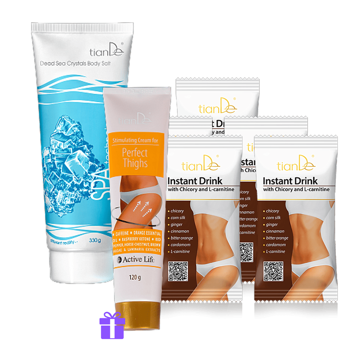 Elegantní křivky vyžadují komplexní přístup. Tělová sůl s podmanivou vůní pomáhá zlepšit tonus a kvalitu pokožky, krém-stimulátor pro dokonalý vzhled stehen se zahřívacím efektem cíleně pečuje o problematické partie a instantní nápoj s čekankou a L-karnitinem* podporuje celkovou vitalitu a vyvážený životní styl. Pořiďte si set pro štíhlou siluetu za výhodnou cenu! Pro dosažení skvělých výsledků nezapomínejte na pravidelný pohyb.