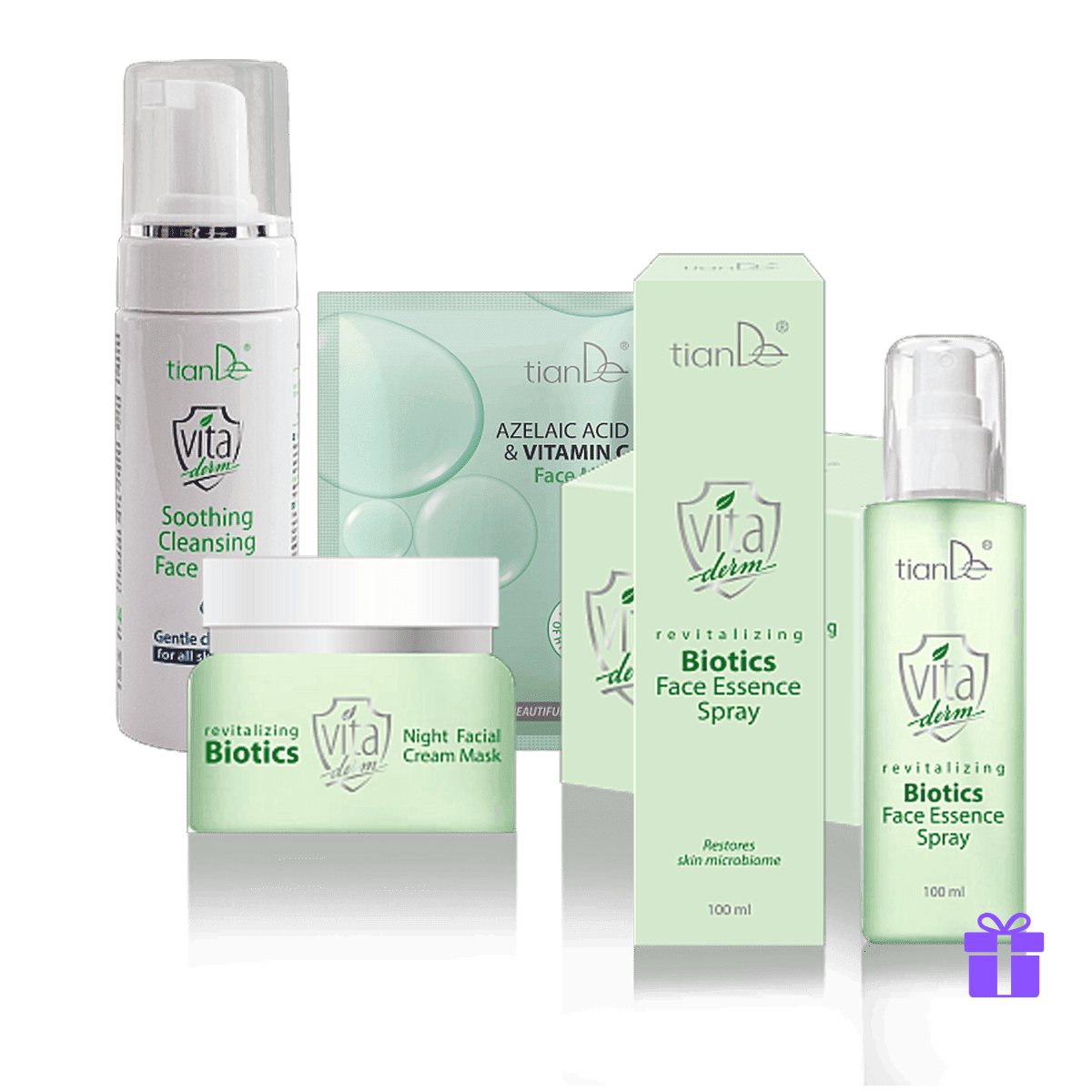 Kupte tři přípravky: zklidňující pleťovou pěnu + revitalizační noční pleťovou krémovou masku Biotics + pleťovou masku Kyselina azelaová a vitamín C, a za 1 Kč získáte revitalizační pleťovou esenci ve spreji Biotics.