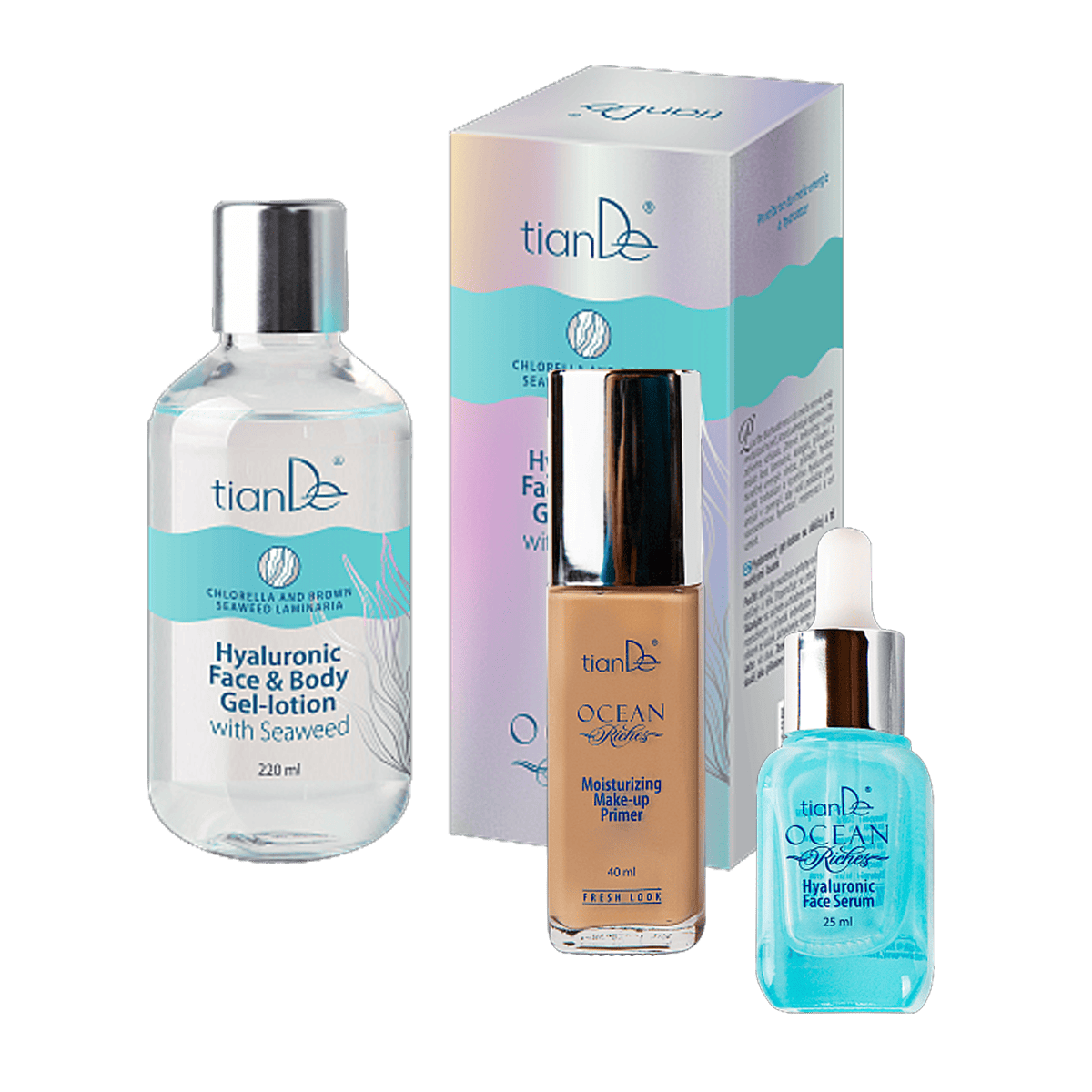 Sada Zářivost pleti obsahuje: hyaluronové serum na obličej hydratační báze pod make-up hyaluronový gel-lotion na obličej a tělo s mořskými řasami